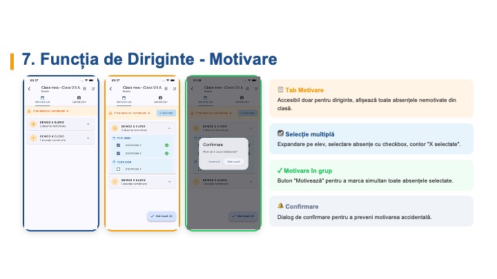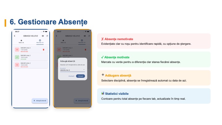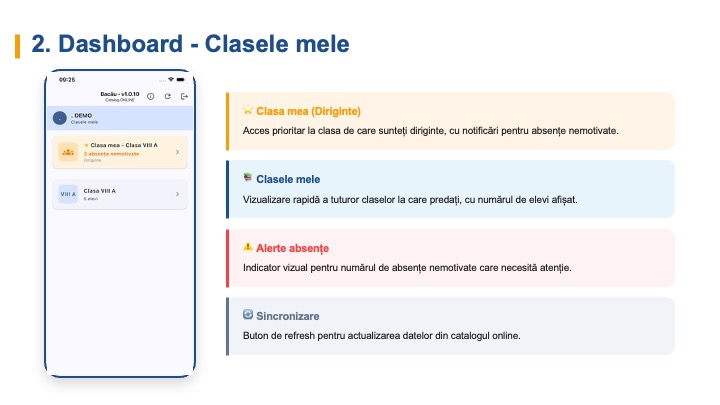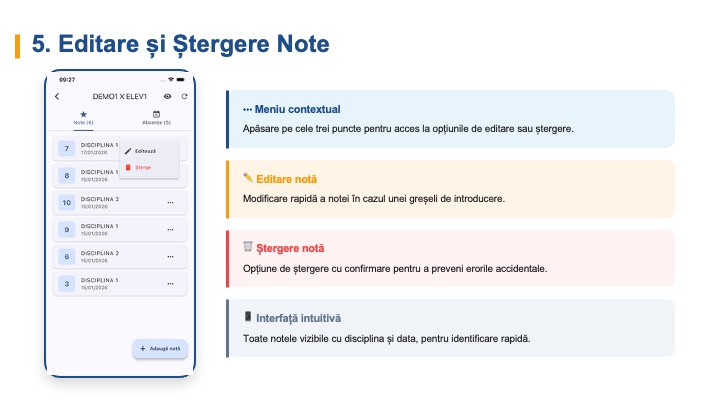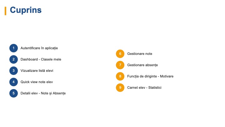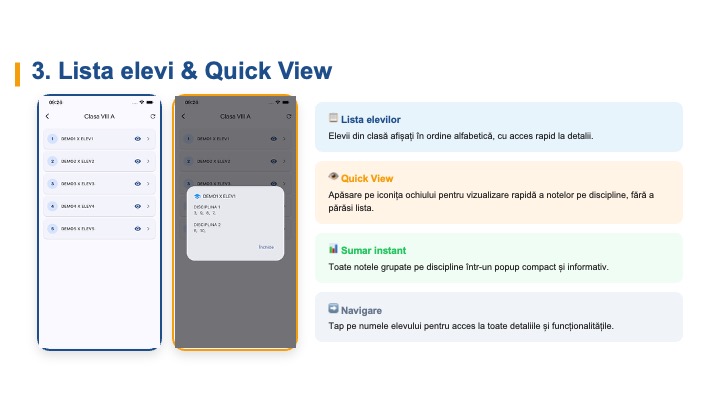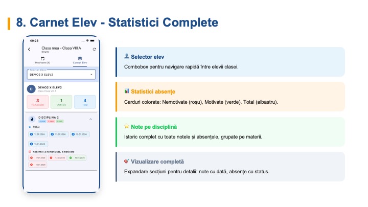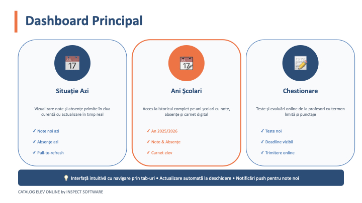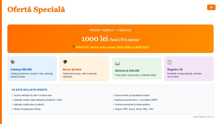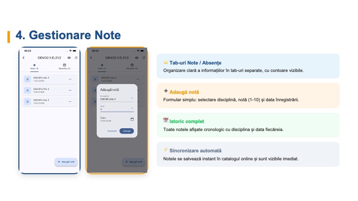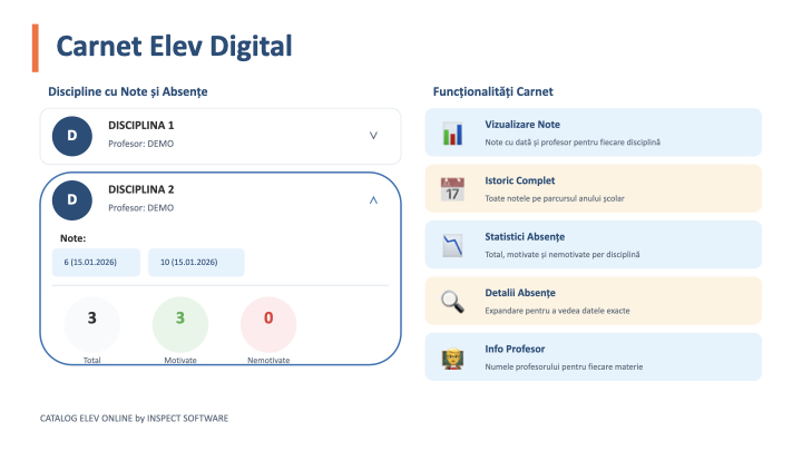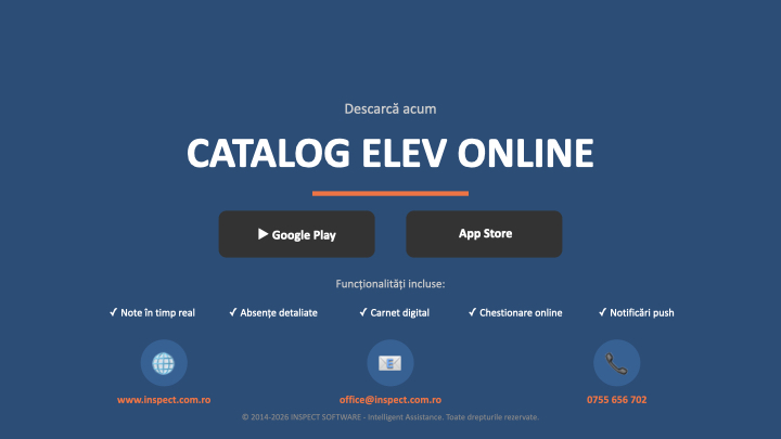 | Rezultate / Catalog | Punctajele și notele obținute de fiecare elev |