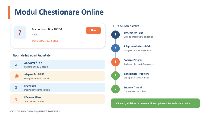 Modulul de Chestionare din platforma permite profesorilor să creeze, să administreze și să evalueze teste online pentru elevi. Sistemul suportă două tipuri principale de chestionare:
